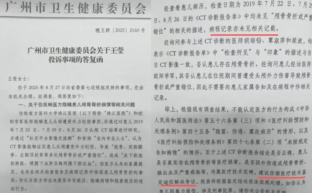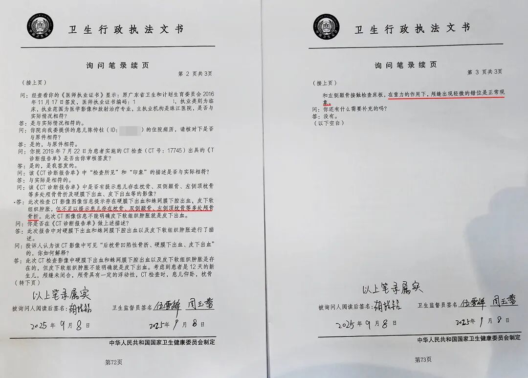 2025年8月,夫妻俩向广州市卫健委反映情况。随后的调查中,医生称,3次检查影像及报告均未提示有颅骨骨折和皮下出血,只提示有硬膜下出血和蛛网膜下腔出血,患儿在住院期间未遭受头颅外力伤害。其中,珠江医院影像科医师胡培铅(2016年开始从业)表示:“患者是新生儿,颅缝未闭合,颅骨具有一定的浮动性,CT检查时,患儿仰卧,枕骨和左侧颞骨接触检查床板,在重力作用下,颅缝出现轻微的错位是正常现象,因而不足以诊断骨折。”