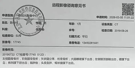 2026年3月6日,有医学影像鉴定资质的北京一脉阳光影像中心给出了《远程影像咨询意见书》:根据影像所见,患者左侧颞骨骨折,右侧颞骨骨折,矢状缝分离,枕骨骨折,大脑镰硬膜下出血;左侧额顶部脑出血,硬膜下出血,蛛网膜下腔出血,脑肿胀,头皮血肿、帽状腱膜下出血。
