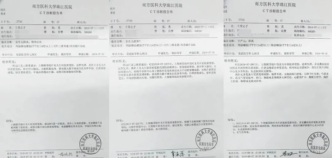 2025年3月—4月,王莹夫妻俩找到孩子出生第12天(2019年7月22日)、第19天(2019年7月29日)和第47天(2019年8月26日)拍摄的头颅CT影像片。他们将片子发到了社交平台专业的医学影像交流群里,并在线下找到医学专家去咨询。得到的结果都是指向外伤的症状。